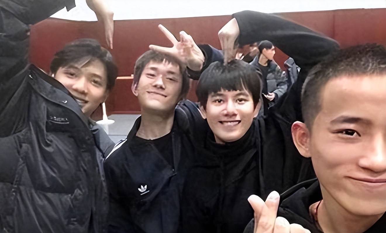 一张泛着时光感的大合照里,四人穿着统一的黑色形体训练服,易烊千玺和胡先煦紧挨着站,笑容灿烂得几乎裂到耳后,李兰迪在一旁笑出浅浅梨涡,整幅画面洋溢着未经雕琢的少年气息。
